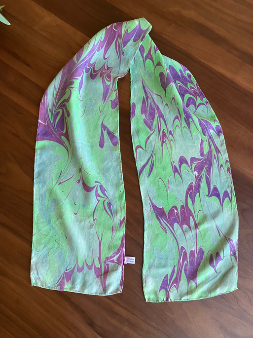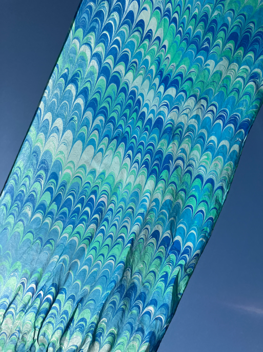 Marbling fabrics is a favorite of mine. Silk is amazing as is satin and cotton, there are just so many options and outcomes. I started with silk scarves but have gone on to cotton for the use of bookbinding. Slowly I'll be adding more photos as I start producing journals, stay tuned!